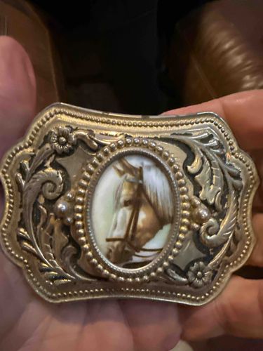 Western-Style Silver Tone Belt Buckle with Hand-Painted Horse Scrimshaw Centerpiece
