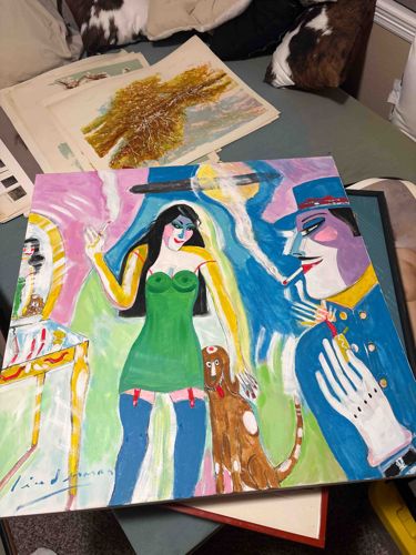 This is a vibrant expressionist oil or acrylic painting on what appears to be a square panel or canvas board. The composition features two main stylized figures: a woman in a short green dress with blue stockings and red garters, and a man in a blue military or tuxedo-style jacket with a top hat. Both figures are holding lit cigarettes, with white smoke trails swirling upward. A small brown dog with white spots sits between them. The style is characterized by bold, saturated colors (pinks, blues, and yellows), heavy outlines, and a flattened perspective reminiscent of Neo-Expressionism or Fauvism. The woman is shown in front of a vanity with a mirror, reflecting her image. Notable signatures are visible in the lower-left corner, appearing to read 'Lindman'. The paint application is thick with visible brushstrokes and impasto techniques. The overall condition shows a slight scuff on the top edge and some minor surface debris, but the pigments remain very bright. The style suggests a late 20th-century origins, likely between 1970 and 1990. The whimsical yet edgy subject matter, combined with the confident use of color, indicates a high level of artistic intent and professional craftsmanship.