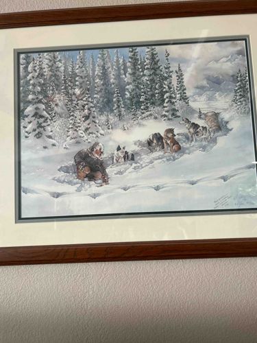 This is a professionally framed and matted print by renowned Alaskan artist Jon Van Zyle. The artwork depicts a winter scene featuring a musher and a team of sled dogs in a snowy wilderness setting, characterized by Van Zyle's signature focus on the Iditarod and Arctic life. The palette is dominated by cool whites, blues, and greys, with the huskies and figure providing grounded earthy tones against the snow-covered evergreen forest. The print appears to be a limited edition or signed artist's proof, as there is visible handwritten text and a signature in the lower right corner onto the print surface. The artwork is housed in a classic wooden frame with a reddish-brown oak finish and is protected by a double-matting system utilizing a neutral off-white outer mat and a darker inner accent mat. The construction indicates high-quality custom framing common in the late 20th century. The condition appears excellent with no visible fading, foxing, or moisture damage, and the glass remains clear without significant scratches. The detail in the fur of the dogs and the texture of the snow demonstrates Van Zyle's meticulous illustrative style, which successfully captures the isolation and ruggedness of the North.