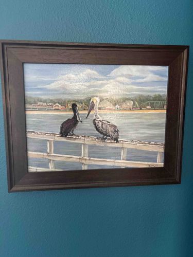 Framed Original Oil or Acrylic Painting of Pelicans at a Coastal Pier