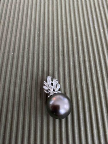 This exquisite pendant features a large, spherical Black South Sea pearl, approximately 10-12mm in diameter, characterized by a deep charcoal to peacock luster with high reflective quality. The pearl is suspended from a decorative white metal bail, likely 18k white gold or platinum, crafted in a foliate or ribbon-like floral motif reminiscent of Jean Schlumberger designs for Tiffany & Co. This bail is meticulously pav-set with several small, brilliant-cut white diamonds that add significant brilliance and contrast against the dark body of the pearl. The craftsmanship exhibits high-end jeweler precision with clean prongs and a seamless integration between the decorative element and the pearl setting. While the maker's marks are not visible in the photograph, the style and provided context point toward a contemporary Tiffany piece. The condition appears excellent with no visible scuffing to the pearl nacre or missing stones in the bail. The hardware shows a bright, polished finish with no signs of tarnish or repair, indicating a well-maintained luxury item.