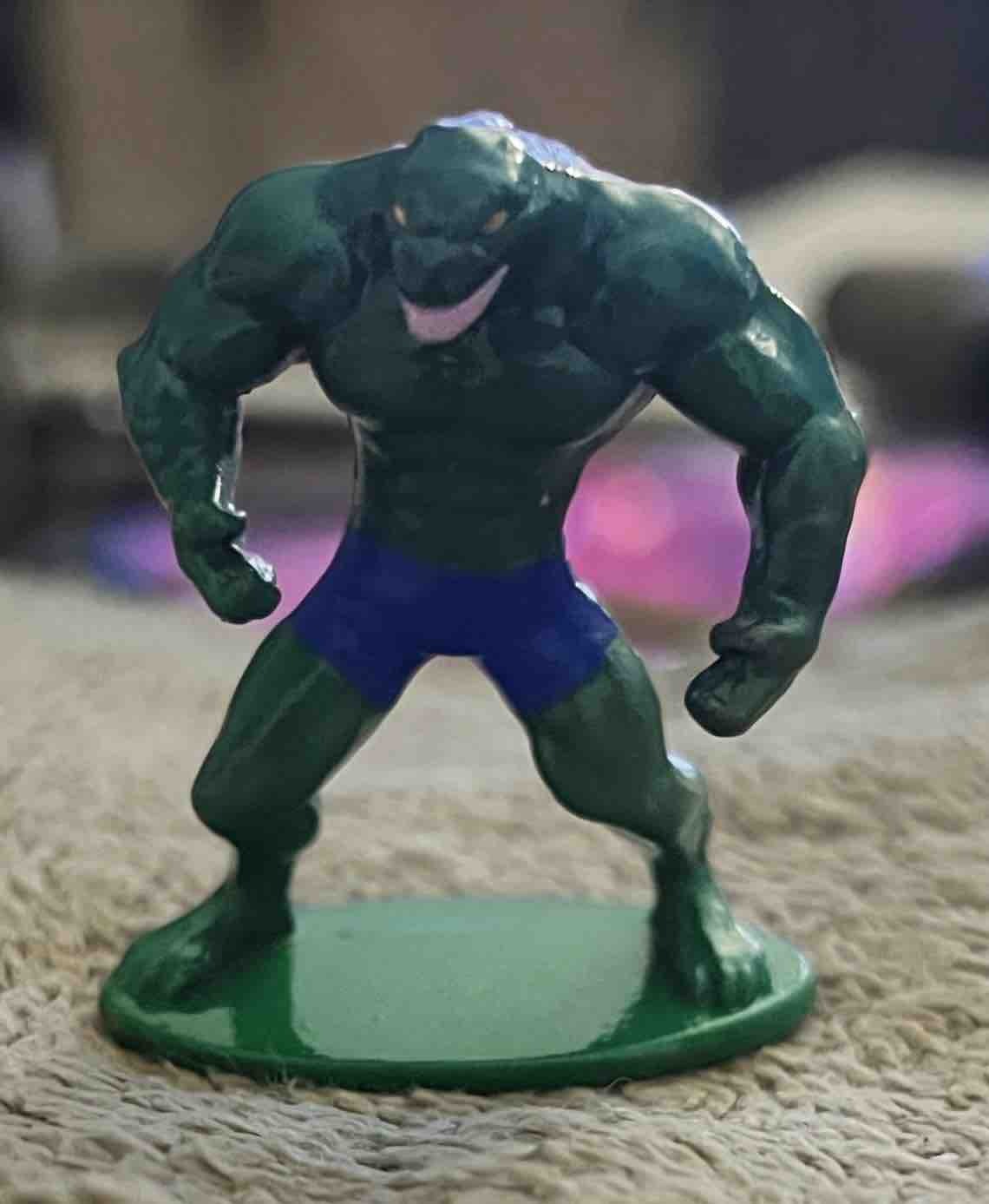 This item is a small molded figurine, likely made of PVC or a similar durable plastic, depicting the reptilian comic book character Killer Croc. The figure is characterized by an exaggerated, hyper-muscular physique with a hunched posture and a snout-like facial structure reminiscent of a crocodile. It is mounted on an integral, circular green base. The color scheme features a dark forest-green skin tone contrasted with bright blue trunks. The eyes are painted small and yellow, and the mouth is slightly agape, revealing a pale pink interior. The paint application appears to be aftermarket or 'custom-painted', as evidenced by the slightly thick and uneven texture of the paint, particularly on the chest and thighs. The surface finish is somewhat glossy, reflecting light in a way that suggests a hobbyist-grade enamel or acrylic sealant was used. There are visible brush strokes and minor imperfections in the paint coverage, such as small specks of blue on the green skin and a slightly irregular transition line at the waist. The molding itself shows decent detail in the muscular definition but lacks the sharp refinement of high-end professional collectibles. The scale appears to be roughly 2 to 3 inches in height, fitting the standard for tabletop miniature gaming or small-scale display dioramas from the late 1990s to early 2000s style.