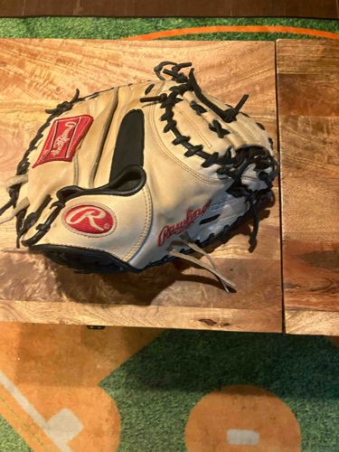 This is a contemporary Rawlings baseball catcher's mitt, contrary to the user-provided text suggesting it is a Wilson A2000. It is constructed from premium 'Camel' or blonde-colored steerhide leather, featuring contrasting black leather accents on the thumb and wrist areas. The glove exhibits the iconic red and white embroidered Rawlings 'R' logo on the thumb and a rectangular red Rawlings brand patch on the wrist closure. It utilizes heavy-duty black leather rawhide lacing throughout the pocket and perimeter to maintain its structure and provide the necessary stiffness for high-impact play. The craftsmanship indicates a professional-grade model, likely from the Heart of the Hide or Pro Preferred series, known for durability and high-quality leather. The mitt shows moderate signs of use, including slight darkening of the leather in high-contact areas, characteristic patina, and some softening of the structure, though it remains in good functional condition. The stitching is tight and appears original. This style of mitt is designed for adult or high-level collegiate use, featuring a deep pocket and reinforced padding to protect the catcher's hand from high-velocity pitches.