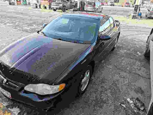 This item is a sixth-generation (2000–2005) Chevrolet Monte Carlo, a front-wheel-drive two-door coupe. The vehicle is finished in a high-gloss black exterior paint, featuring a distinctive aerodynamic profile with a long hood and short rear deck. It is equipped with five-spoke alloy wheels and integrated fog lamps within the front fascia. Characterized by its sweeping vertical body lines and 'cat-eye' inspired headlight housings, this model represents the styling of the early 2000s American 'personal luxury' car segment. Physical condition appears used; the headlight lenses show significant oxidation or 'clouding,' which is a common age-related issue for polycarbonate housings. The front lower air dam shows some potential scuffing or road rash. The paint maintains a reflective quality but likely has minor surface swirl marks consistent with its age. There are no obvious major structural dents visible in this low-resolution image, though several small dings may be present on the passenger door panel. This vehicle likely features a 3.4L or 3.8L V6 engine, common for the era, and represents a high-volume production period for General Motors.