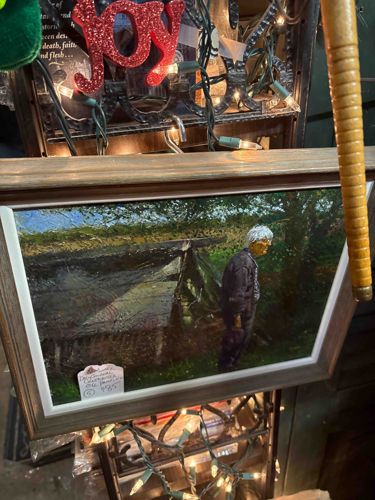 This is a horizontal rectangular oil painting executed in a heavy impasto, impressionistic style. The artwork depicts an elderly male figure standing in profile in an outdoor setting, likely a garden or wooded area, next to what appears to be a stone wall or low structure. The figure has white hair and wears dark clothing, possibly a suit or formal attire. The color palette is dominated by earthy tones, deep greens, and blacks, with dappled light filtering through a canopy of trees in the background. The application of paint is thick and textured, creating a sense of depth and movement on the canvas. The painting is housed in a contemporary wooden frame with a grey-brown finish and a thin white inner liner. A retail tag in the lower-left corner identifies the piece as an original oil painting. The overall condition appears excellent with no visible craquelure, paint loss, or damage to the frame. The style suggests a late 20th-century or contemporary creation by a skilled hobbyist or professional artist focusing on tonal landscape and portraiture. The light source in the painting is well-defined, highlighting the crown of the subject's head and the upper foliage, demonstrating a high level of technical competency in handling naturalistic lighting.