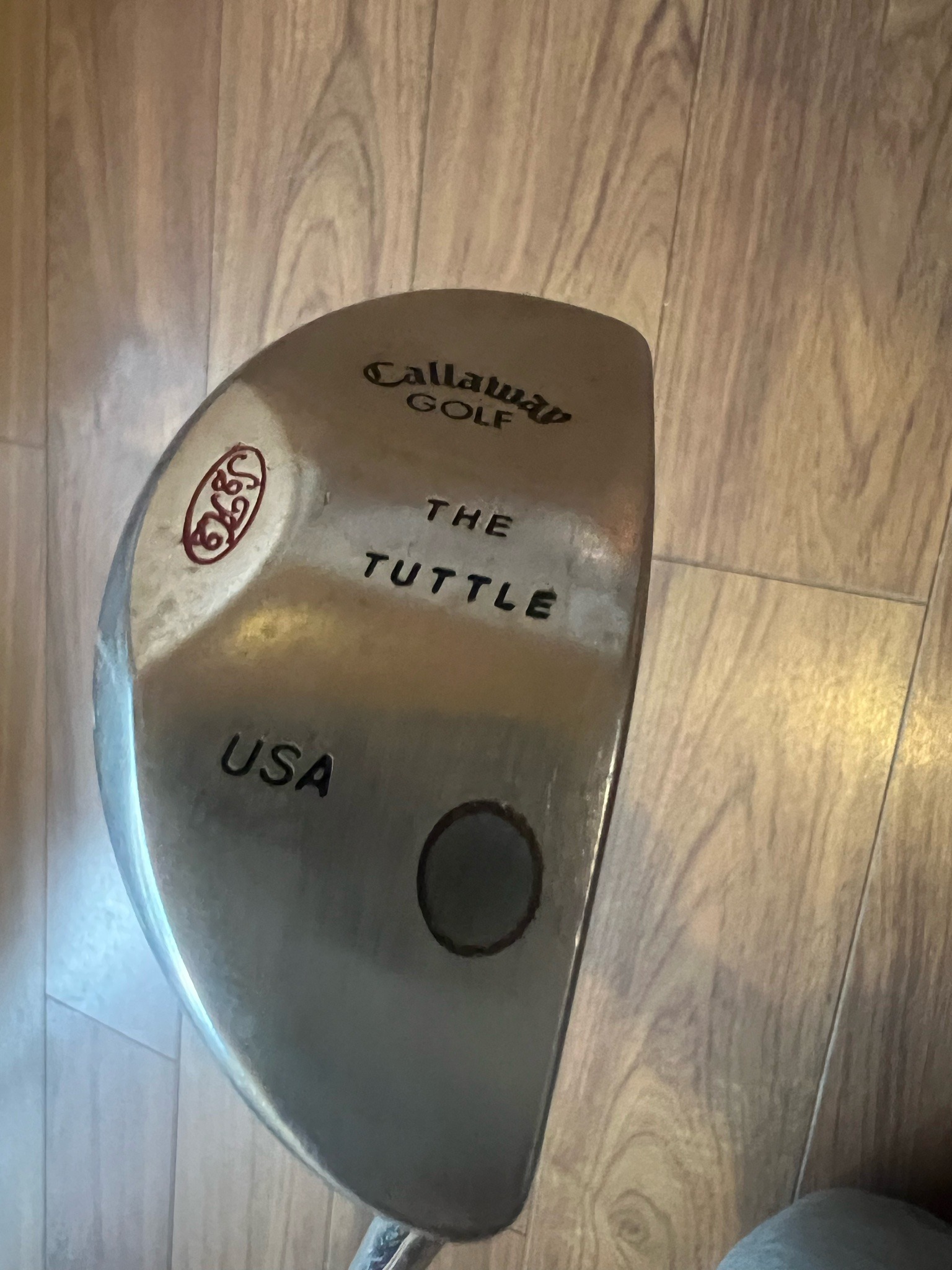 This is an original Callaway Golf mallet-style putter, specifically identified by the model name 'The Tuttle' engraved on the sole. The club head is constructed from cast stainless steel with a characteristic soft satin finish. It features a distinct D-shaped or semi-circular mallet profile, which was revolutionary for its time in providing high Moment of Inertia (MOI) for stability. The sole of the club is marked with several deep-etched identifiers: the 'Callaway GOLF' script logo, 'THE TUTTLE' model name in bold block letters, 'USA' indicating its manufacturing origin, and a red circular S2H2 logo. The S2H2 branding stands for 'Short Straight Hollow Hosel,' a design innovation by Callaway that removed weight from the hosel to redistribute it lower and into the clubhead for a larger sweet spot. There is also a circular weight port visible on the sole. In terms of condition, the club shows signs of moderate use consistent with its age, including surface scratches, minor bag chatter (nicks), and some loss of finish on the trailing edge. The paint fill in the lettering remains largely intact. This model dates back to the early-to-mid 1990s and represents a significant period in the evolution of modern mallet putters.