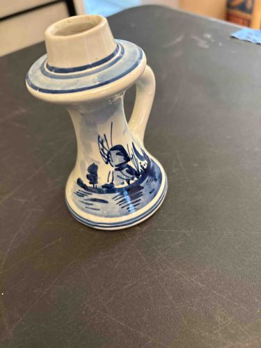 This item is a small, hand-painted ceramic candlestick holder featuring a traditional Dutch-inspired Delft Blue aesthetic. The piece is constructed from white glazed earthenware or porcelain, characterized by a flared circular base that tapers into a slender, waisted neck and terminates in a round candle socket with a protective drip rim. A small curved handle connects the neck to the base for portability. The decoration consists of cobalt blue underglaze painting, depicting a stylized windmill scene with water and trees, typical of 20th-century souvenir ware. Blue concentric bands accent the rim and base. The quality of the brushwork is somewhat loose and folk-like rather than fine art, suggesting a mass-produced or hobbyist piece from the mid-to-late 20th century. The condition appears fair with visible glaze imperfections and light surface wear consistent with age, though no major cracks or structural repairs are immediately evident. While the user provided context mentions fine crystal, this physical specimen is definitely opaque ceramic.