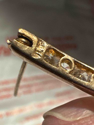 This item is a single gold-toned earring, featuring a channel-set row of clear, round-cut faceted stones, likely cubic zirconia or high-quality glass crystals. The metal appears to be a gold-plated base metal, as evidenced by the 'SETA' maker's mark stamped into the interior of the setting at the hinge point. SETA is a well-known brand specializing in affordable fashion and bridal-style costume jewelry. The construction features a hinge mechanism and a straight post for pierced ears, typical of a 'huggie' or small hoop-style tennis earring. The stones are uniform in size and clarity, exhibiting a brilliant cut to maximize sparkle. Regarding condition, there is visible oxidation and darkening of the metal in the hard-to-reach crevices between the stones and around the hinge area, suggesting it is a vintage or previously worn piece from the late 20th or early 21st century. The post shows slight discoloration from use. Despite the surface patina, the stones appear securely seated within the channel walls. The craftsmanship is consistent with mass-produced quality costume jewelry, focusing on aesthetic sparkle and classic styling rather than precious material value.
