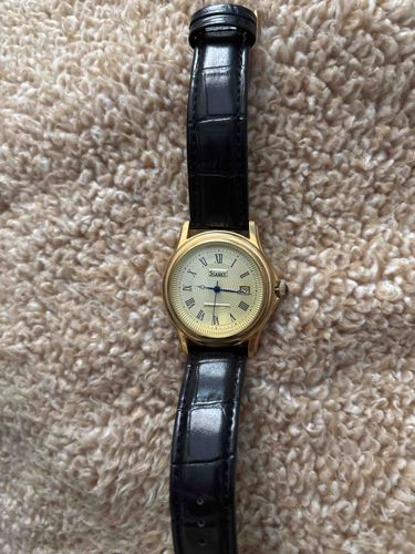 This is a classic-style dress wristwatch featuring a round gold-tone case, likely base metal with a polished finish. The watch possesses an off-white or champagne-colored dial distinguished by black Roman numeral hour markers and a stepped outer minute track. The brand name 'SIARET' is prominently displayed below the 12 o'clock position. It features a three-hand analog display with a slender blued-steel or dark metal handset, including a central seconds hand. A date window is positioned at the 3 o'clock mark. The watch is fitted with a black leather-style strap featuring a faux-alligator embossed texture and matching black stitching. Mechanically, the watch appears to be a battery-operated quartz movement, given its style and market position. The condition appears to be fair to good, with some visible oxidation or wear on the gold-toned crown and light scuffing on the lugs. The glass crystal appears clear without major fractures. This timepiece reflects a traditional aesthetics common in late 20th-century fashion watches, prioritized for casual or business-wear utility.