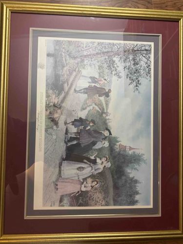 This is a rectangular framed offset lithographic print depicting a group of 18th-century/Colonial American-style figures walking down a path toward a church in a lush, wooded landscape. The artwork is oriented horizontally within a vertical frame, a stylistic choice common for mass-produced historical reproductions. The color palette is composed of soft pastels, featuring muted blues, greens, and pinks. The print is housed in a contemporary gold-finished wooden or composite frame with visible mitered corners. It is professionally matted using a multi-layer technique: a wide outer mat in a deep burgundy or maroon shade and a thinner inner mat in a beige or light tan ivory. The print itself contains visible text along the left side (bottom when oriented correctly), which likely includes the title 'Sunday Morning in Sleepy Hollow' and possibly a reference to the artist, such as Jennie Augusta Brownscombe. There is a small crest or logo in the top left corner of the print's border, characteristic of 20th-century decorative art suites. The condition appears fair to good; the frame shows minor surface abrasions and light dust, while the print exhibits slight fading consistent with UV exposure. The glass covering the piece shows significant glare, indicating standard rather than anti-reflective glazing. This piece likely dates from the late 20th century as a decorative reproduction of a much earlier Americana oil painting.