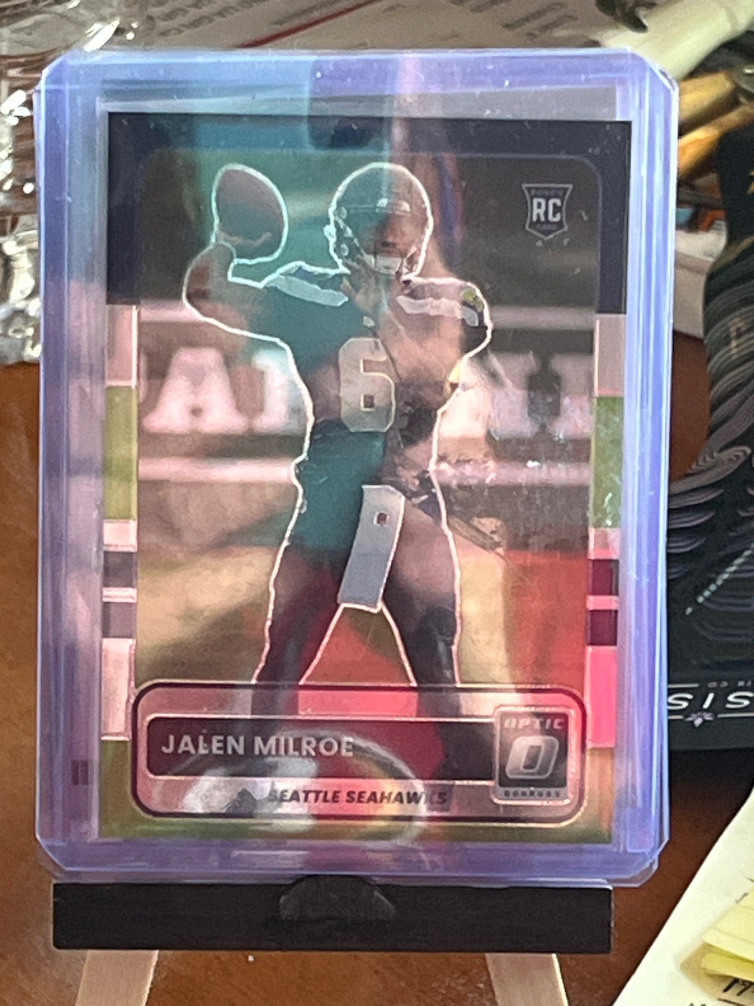 This is a custom or 'art' trading card featuring Jalen Milroe depicted in a Seattle Seahawks uniform. The card mimics the Donruss Optic 'Rated Rookie' design, featuring a prominent 'RC' rookie card shield in the upper right and the Donruss Optic logo at the bottom right. The design utilizes a 'Holo' or 'Prizm' chrome-like substrate that reflects a rainbow spectrum of light across its surface. The player is shown in a dynamic passing pose, centrally framed with a thick metallic border at the bottom containing the player's name and team. Physically, the card appears to be of standard trading card dimensions (2.5 x 3.5 inches) and is currently preserved in a plastic top-loader for protection. Note that because Jalen Milroe remains a college athlete (Alabama) as of the 2023-24 season, this specific card represents a 'prospect' or 'custom' creation rather than an official NFL league release, as he was not yet on the Seahawks roster. The condition appears excellent with crisp corners visible through the holder, though there is minor surface smudging on the exterior plastic protector. The printing quality shows high-gloss finishing characteristic of modern premium sports cards.