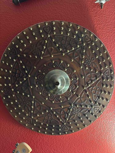 This is a circular highland targe, a traditional style of shield used by Scottish Highlanders. It is constructed from a dark-stained wood base covered with leather or a synthetic equivalent, meticulously decorated with numerous small brass studs arranged in geometric patterns. The face features deep-relief embossing including Celtic-style knotwork, triquetras, and heart motifs within an eight-pointed star configuration. At the center is a polished metal umbo (boss), likely made of steel or nickel-plated brass, which transitions to a central spike hole. The circumference of the shield measures approximately 18 to 20 inches. The craftsmanship suggests a high-quality modern reproduction intended for display or reenactment rather than an antique original. The surface shows minor signs of light dust and superficial oxidation on the brass studs (patina), but the wood and leather-work appear intact without major structural cracks or tears. The overall style is consistent with late 20th-century or 21st-century historical weaponry replicas, mimicking the aesthetic of the Jacobite era.