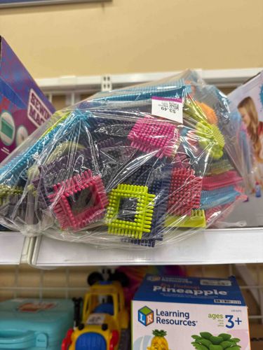 This item is a bulk assortment of Bristle Blocks, a classic interlocking building toy for children. The set consists of numerous plastic pieces in various geometric shapes, including squares, rectangles, and triangles, featuring the signature 'bristle' or 'comb-like' teeth on all sides that allow them to stick together at any angle. The pieces are rendered in a vibrant, multi-colored palette including bright pink, lime green, navy blue, turquoise, purple, and orange. Constructed from a durable, slightly flexible BPA-free plastic, these blocks are designed for tactile sensory play and early STEM development. The collection appears to be a mixed lot of standard pieces and specialty framed shapes. In terms of condition, the items are pre-owned and currently contained within a clear polyethylene thrift store bag with a white price tag of $3.49. While the blocks show minor signs of play wear such as light scuffing, they appear structurally sound with no significant broken bristles visible. Based on the color scheme and design, these likely date from the late 2010s to the present, manufactured by Battat or a similar toy company. The craftsmanship is consistent with mass-produced educational toys, prioritizing durability and safety for ages 2 and up.