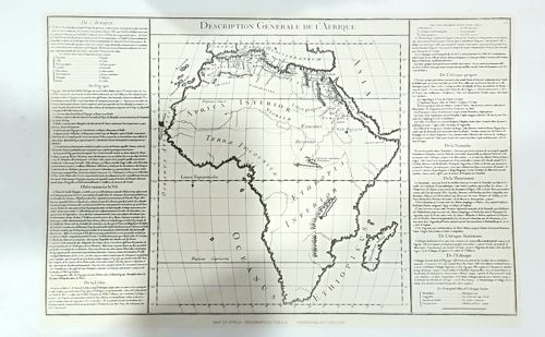 This item is an antique-style monochrome map print titled 'Description Générale de l’Afrique'. The central graphic features a map of the African continent with topographical markings such as mountain ranges, rivers, and regional labels in Latin, including 'Terra Incognita' across the central region and 'Africa Interior' in the north. The map is bordered by extensive French text columns on both the left and right sides, detailing various geographical sections like 'De L'Egypte' and 'De La Libye'. The print is executed on a rectangular, off-white or cream-colored paper stock with a visible black ink border. While designed to resemble an 18th-century copperplate engraving, certain characteristics such as the extreme crispness of the lettering and the modern English text at the bottom footer ('MAP OF AFRICA GEOGRAPHICA TABULA') suggest this is a high-quality modern reproduction or a 20th-century decorative lithograph rather than an original period artifact. The condition appears excellent with no visible foxing, tears, or creases, and the ink remains uniformly dark. The layout adheres to a classical encyclopedic style, utilizing several different font weights and sizes to organize information around the central cartographic image.