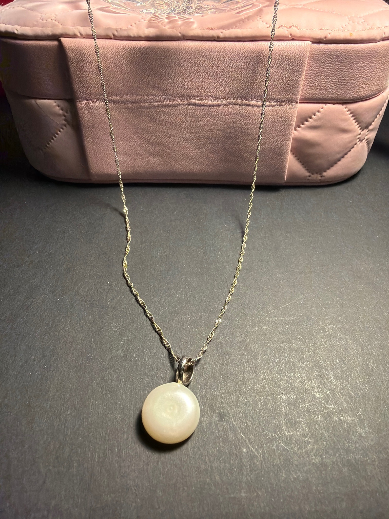 This jewelry piece consists of a large, blister-style Mabe pearl or mother-of-pearl cabochon pendant suspended from a fine Singapore-style chain. The pendant features a creamy, iridescent white circular stone with a subtle pearlescent luster. It is set in a simple, high-polish silver-toned metal bail, which appears to be sterling silver based on the typical pairing with this material. The chain is a twisted, reflective 'Singapore' design that creates a sparkling effect when it catches the light. The pearl is approximately 15-20mm in diameter, featuring a domed surface with a slight central indentation or growth mark characteristic of organic gemstones. The condition of the piece appears good; the metal shows minor micro-scratching consistent with light wear, and the pearl maintains a smooth surface without visible chips or cracks. While no hallmarks are visible in the photo, the construction suggests a contemporary or late 20th-century piece (circa 1980s-2000s) often found in fine fashion jewelry categories. The organic luminescence of the focal stone and the delicate craftsmanship of the chain suggest a piece designed for both evening and day wear.