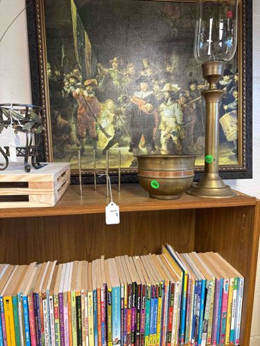 This item is a framed print or canvas reproduction of Rembrandt van Rijn’s famous 1642 masterpiece, officially titled 'Militia Company of District II under the Command of Captain Frans Banninck Cocq', commonly known as 'The Night Watch'. The piece exhibits the characteristic baroque use of chiaroscuro (strong contrasts between light and dark) to depict a group of Dutch civic guardsmen. The scene is presented in a large format within a substantial, ornate composite or wooden frame. The frame features a dark, perhaps ebony-finished outer molding with a beaded or textured interior gilt edge, suggesting a traditional or transitional style consistent with late 20th-century home decor. Physically, the artwork appears to be a textured print surface, possibly on board or canvas, which mimics the original oil-on-canvas brushwork. The colors are dominated by earthy ochres, deep blacks, and muted reds, which are typical of the aged varnish appearance of the original. The condition shows some surface dust and minor scuffing on the frame edges, consistent with being displayed in a retail or thrift setting. There are no immediately visible rips in the substrate, though the overall luminosity is slightly flattened compared to the original due to the reproduction process. A green price sticker is visible on the glass of a lamp in front of it, and the piece sits behind several decorative objects on a wooden shelf, making detailed examination of the lower canvas edge and potential artist/manufacturer signatures difficult. The scale suggests it is intended as a prominent wall statement piece.