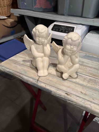 This item consists of a matching pair of decorative ceramic figurines depicting pensive cherubs or putti. Each figure is crafted in a seated, thoughtful pose; the figure on the left sits with legs straight forward, resting its chin on its hand, while the figure on the right is similarly posed with crossed legs and hands under its chin. Both figures feature a high-gloss, creamy-white or off-white glaze over a ceramic body, likely earthenware or porcelain. The modeling of the hair, wings, and facial features exhibits rounded, soft detailing characteristic of mid-20th-century decorative kitsch or religious giftware. Each piece measures approximately 5 to 7 inches in height. The style is reminiscent of Renaissance-inspired motifs often found in Italian or American ceramics from the 1960s or 1970s. Visible condition appears good with high reflectivity, though close inspection would be required to identify fine crazing, which is common in older glazed ceramics. There are no immediate signs of major chips or repairs visible in the provided image. The craftsmanship is commercial grade, intended for interior home decor or shelf display.