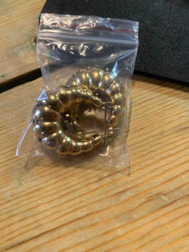 This item is a pair of vintage-style hoop earrings, commonly referred to as 'shrimp' or 'croissant' hoops due to their tapered, segmented, and bulbous shape. Each earring features a graduated design that is thickest at the bottom and tapers toward the top where the closure is located. The earrings are constructed with a high-polish yellow-gold finish, likely gold-plated or gold-filled base metal given the luster. The surface is characterized by prominent vertical ribbing or gadrooning, which creates a textured, undulating surface that reflects light at multiple angles. Each segment has a rounded, puffed appearance, suggesting they may be hollow-formed to allow for a large, bold aesthetic without excessive weight for the wearer. The earrings utilize a traditional saddleback or click-top latch closure with a hinged wire post. In terms of condition, the items appear well-maintained within a protective plastic bag; however, there is visible minor surface scratching and some slight darkening or tarnish within the recessed grooves of the ribs, which is typical for vintage costume or mid-range fine jewelry. No obvious maker's marks are visible through the packaging, but the style is indicative of late 20th-century fashion jewelry, specifically the 1980s or 1990s. The craftsmanship shows consistent spacing between the ribs and a symmetrical taper, indicating good mass-market quality for the period.