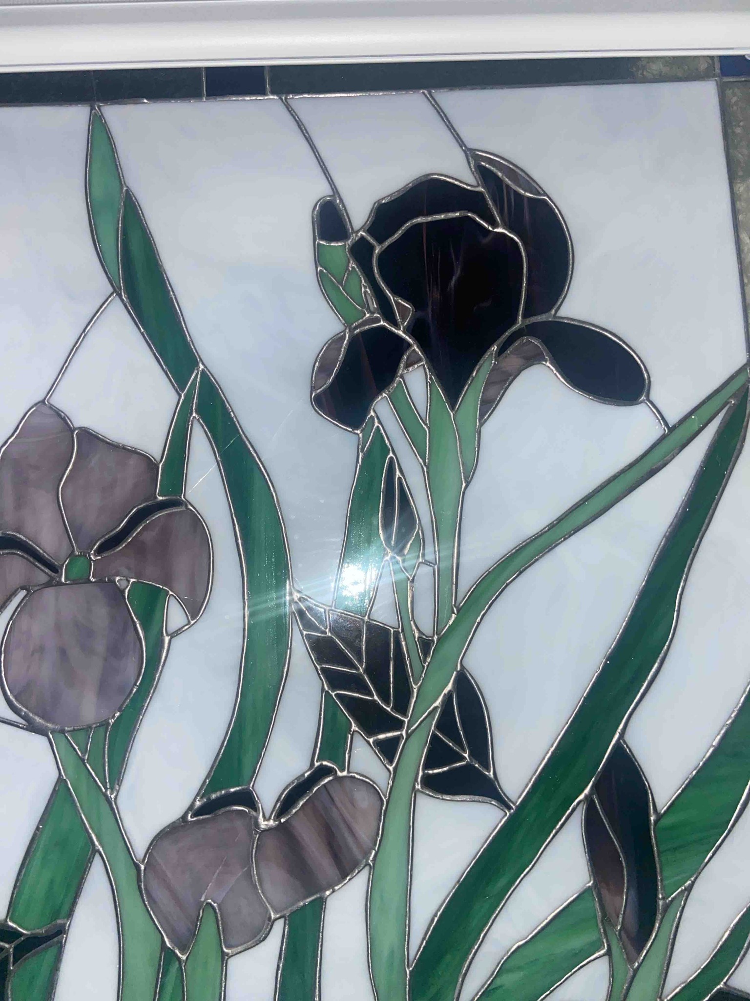 This is a detailed stained glass window panel featuring an Art Nouveau-inspired iris floral motif. The panel is constructed using the copper foil method (Tiffany style), characterized by the thin, uniform lead solder lines connecting the various glass segments. The composition depicts three blooming iris flowers and associated foliage against a background of opaque, milky-white slag glass with faint blue and grey marbling. The irises are rendered in deep violet, plum, and dark amethyst tones, while the long, graceful leaves are composed of variegated forest green and emerald green glass. The stems and leaves show internal striations that mimic natural organic textures. The craftsmanship appears to be of high amateur or professional quality, with smooth soldering and complex curved cuts. The style is reminiscent of the late 20th-century revival of classical stained glass designs, likely dating from the 1970s to the 1990s. Notably, there is a visible hairline crack on the upper left side of the white background pane and another small fracture in one of the central green leaves, appearing to stem from structural stress or minor impact. There are no visible maker's marks or signatures in the provided view. The panel is housed in a modern white frame, which suggests it may have been repurposed as an interior decorative hanging piece rather than an original architectural window.
