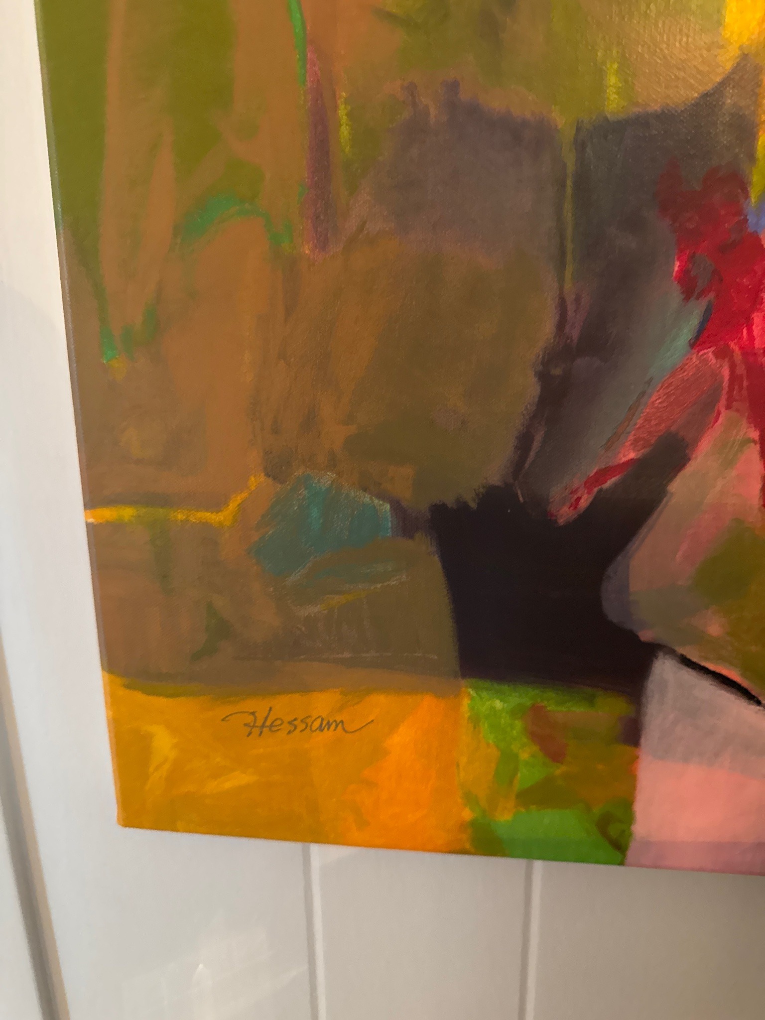 This is an original contemporary painting on canvas, identifiable by the distinctive signature 'Hessam' in the lower-left corner, which is the professional mark of the renowned Iranian-born artist Hessam Abrishami. The work is executed in an abstract expressionist style with a figural emphasis, a hallmark of the artist's 'Expressionism' movement. The color palette is vibrant and rich, utilizing a sophisticated blend of ochre, mustard yellow, deep reds, forest greens, and muted earthy browns. The application of paint reveals a confident, fluid hand with visible brushwork and layered impasto that creates a sense of movement and depth. The canvas surface shows a fine-grained texture typical of high-quality artist-grade cotton or linen support. This particular piece appears to be in excellent condition with no visible signs of craquelure, paint loss, or environmental damage. The colors remain saturated, suggesting it has been kept in a stable environment. The style is characteristic of Abrishami’s prolific period between the late 20th and early 21st centuries, reflecting his focus on fluid lines and the emotional energy of human figures. The craftsmanship is professional, showing a mastery of color theory and spatial arrangement that is highly sought after by collectors of modern abstract art.