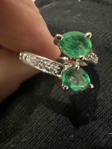 This contemporary bypass style ring, often referred to as a 'Toi et Moi' (You and Me) design, features two pear-cut green gemstones, likely treated emeralds or high-quality cubic zirconia simulated emeralds. Each pear-shaped stone is securely held in a three-prong setting, oriented in opposing directions to create a sense of movement. The stones exhibit a vibrant, medium-saturated green hue with visible internal inclusions, which is characteristic of natural emeralds. The band is constructed from a silver-toned metal, such as sterling silver or white gold, though no visible hallmarking is identifiable from this perspective. The shoulders of the ring are channel-set with small round white accent stones, presumably diamonds or cubic zirconia, which add a brilliant contrast to the central green stones. In terms of condition, the piece shows minor surface scratches consistent with light wear. The prongs appear intact and well-aligned, indicating good structural integrity. This style, while classic in origin, reflects a modern manufacturing aesthetic typical of the late 20th or early 21st century. The craftsmanship is clean, focusing on a minimalist yet elegant bypass silhouette.