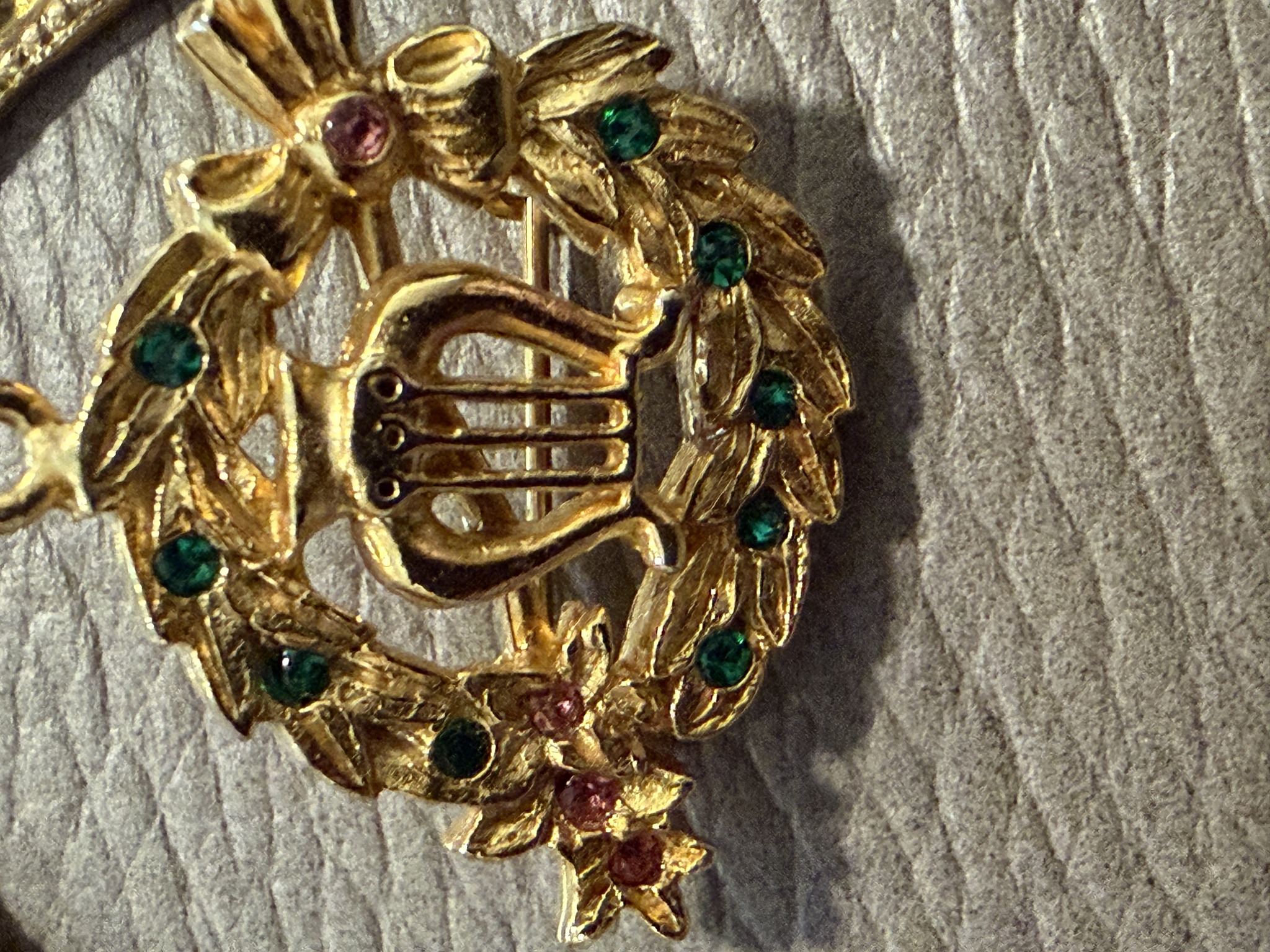 Vintage Gold Tone Lyre and Wreath Brooch with Rhinestones