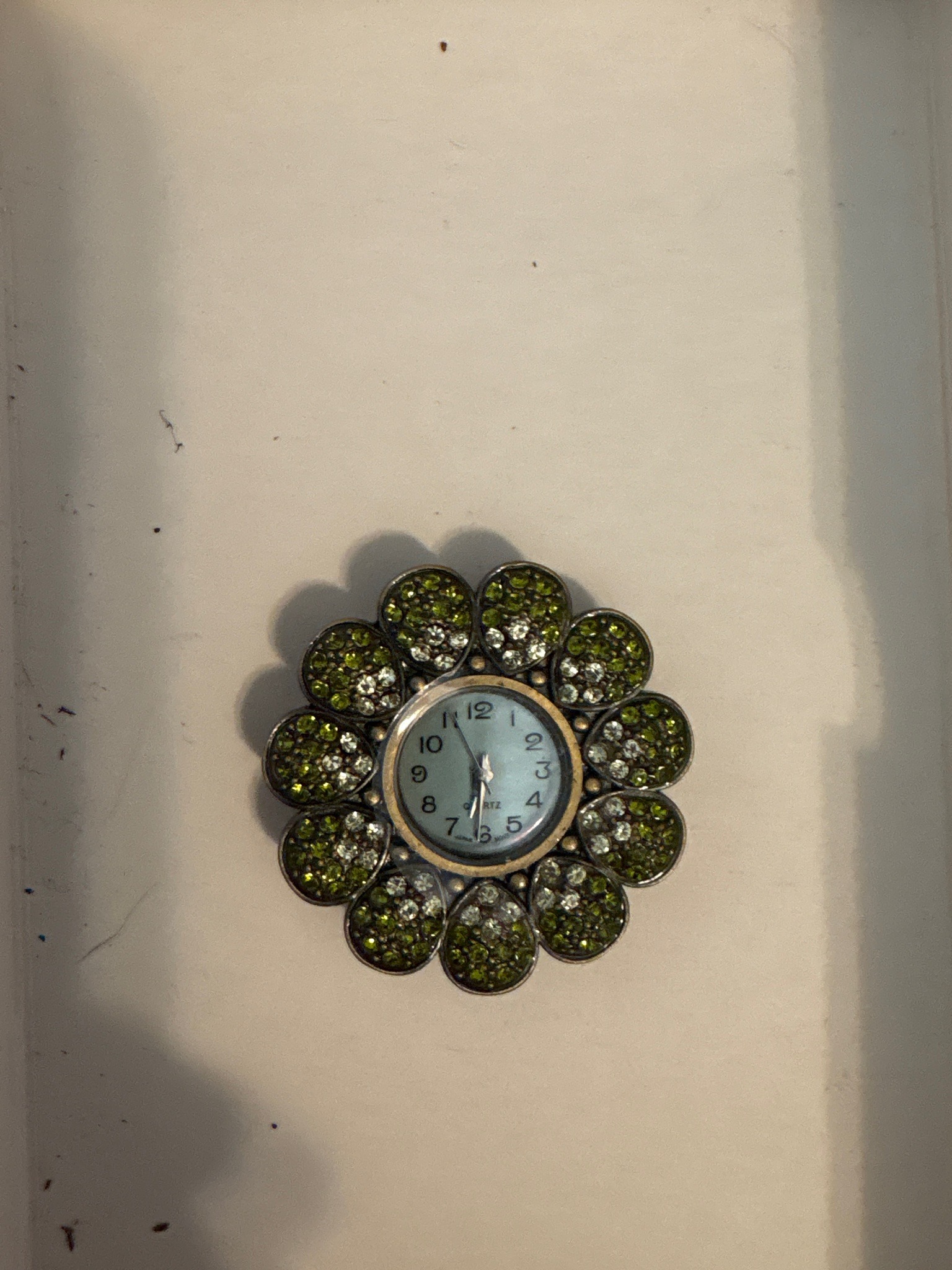 This item is a decorative brooch or lapel pin that doubles as a functional timepiece, designed in the shape of a multi-petaled flower. The central element is a small, circular quartz-movement watch face with a light blue metallic or sunburst dial. It features black Arabic numerals, an inner minute track, and thin metallic hands. Encircling the timepiece are twelve 'petals,' each pavé-set with a mixture of lime green and clear/white faceted rhinestones. The metal frame appears to be a silver-toned base metal with an antiqued or slightly oxidized finish, particularly visible in the recessed areas between the stones and around the watch bezel. In terms of construction, the piece likely dates from the late 20th century to early 2000s, reflecting a costume jewelry aesthetic common in mass-market fashion boutiques. The dial is marked with 'QUARTZ' and 'Japan Movt' at the bottom, indicating a standard Japanese movement housed in a Chinese-made casing. The condition shows light wear consistent with age, including some minor surface tarnish on the metal rim and dust accumulated in the crevices of the stone settings. All visible stones appear to be intact, and the crystal over the watch face shows no significant scratching, though its functional state is unknown without testing the battery.