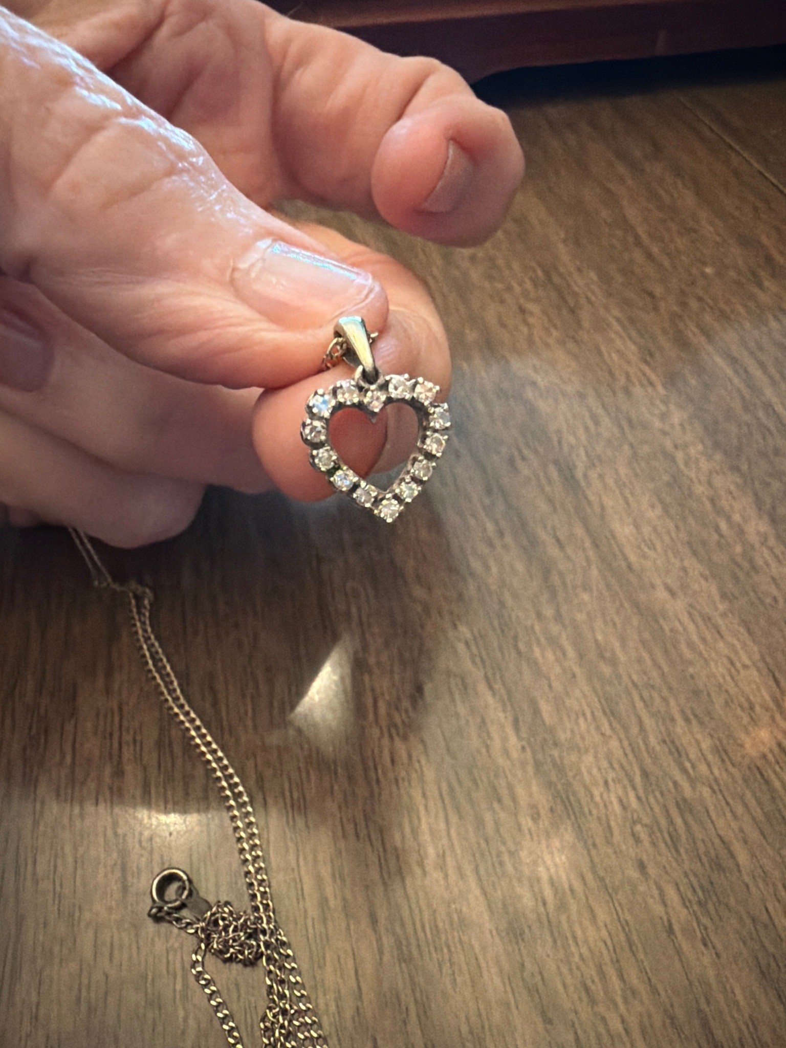 This item is a petite heart-shaped pendant suspended from a fine curb link chain. The pendant features an open-heart design meticulously set with approximately fourteen small, round faceted gemstones, likely diamonds, in a traditional prong or bead setting. The metal appears to be white gold or sterling silver, displaying a bright, polished luster. The pendant is attached to the chain via a polished tapered bail. The accompanying chain is a delicate, thin-gauge metal with a classic spring ring clasp closure. Overall, the piece reflects contemporary jewelry design styles common from the late 20th century to the present day. Regarding condition, the metal surfaces show minor micro-abrasions consistent with gentle use, but no significant structural damage or missing stones are visible in the provided image. The craftsmanship indicates a commercial-to-fine jewelry quality, with uniform stone placement and a secure setting. While no hallmark is visible in the photograph, such pieces are typically struck with '10K', '14K', or '925' on the bail or the clasp of the chain to indicate metal purity. The design is timeless, making it a versatile piece appropriate for daily wear or sentimental gifting.
