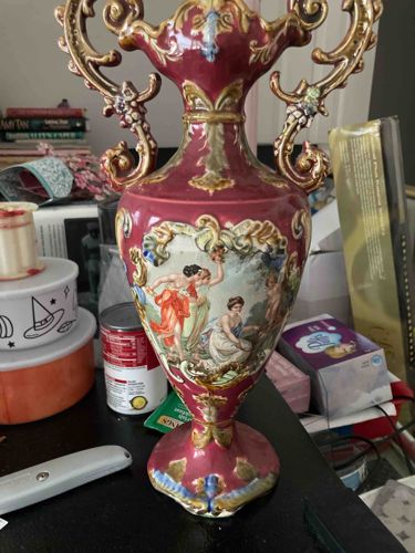 This item is an ornate, double-handled ceramic urn or decorative vase, likely dating from the late 19th to early 20th century. It features a striking deep burgundy or maroon base glaze with extensive gold-leaf or gilt accents. The body is urn-shaped with a slender neck and a flared pedestal base. The most prominent feature is a central cartouche framed by raised, Rococo-style scrolling gilt ornamentation, containing a hand-painted or high-quality transfer-ware scene of classical maidens and cherubs in a pastoral setting. The style is reminiscent of Sèvres or Capodimonte porcelain, characterized by the elaborate, exuberant handles with floral and C-scroll motifs. The craftsmanship displays heavy relief work and multi-chrome hand-painted details. Regarding condition, there is visible wear to the gilding, particularly on the prominent edges of the handles and base, indicating age and handling. Some minor surface grime or craquelure in the glaze may be present. The piece overall reflects a highly decorative Victorian or Edwardian aesthetic, designed to mimic high-end 18th-century European porcelain.
