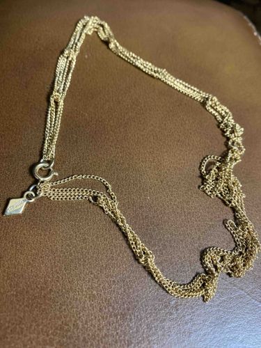 This item is a vintage multi-strand necklace finished in a bright gold-tone metal. The design features four delicate, parallel curb chains that are periodically gathered and Held together by stationary rectangular spacers, giving the piece a structured yet fluid aesthetic. The necklace is secured with a traditional spring-ring clasp. Attached to the clasp assembly is a distinctive diamond-shaped metal hangtag, which is a hallmark of Trifari jewelry. Although specific stamped marks are difficult to resolve in the image, the presence of the lozenge-shaped hangtag suggests a mid-20th-century origins, likely between the 1950s and 1970s. The metal exhibits a consistent yellow gold luster with no immediately visible signs of heavy verdigris or major plating loss, though minor surface scratches and faint patina are expected for its age. The craftsmanship is typical of high-quality costume jewelry of the era, showcasing the costume jewelry industry's ability to mimic fine jewelry through intricate chain work and polished finishing. The piece measures approximately 15 to 18 inches in length, characteristic of a standard princess-style necklace. Its classic multi-row design remains a timeless example of collectible mid-century costume accessories.