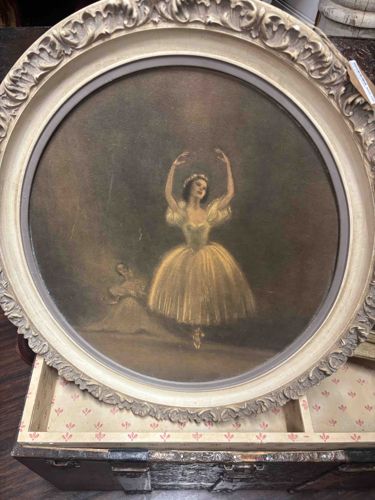 This is a vintage circular oil painting on canvas featuring a central figure of a ballerina in a classical pose. The dancer is depicted in a glowing yellow or gold tutu with a floral headpiece, her arms raised in a fifth position en haut. In the background, a seated secondary figure is visible in a more muted, ethereal rendering, suggesting a rehearsal or stage setting. The canvas is circular and measures approximately 20-24 inches in diameter. The color palette is dominated by earthy browns, ochres, and deep umber, creating a dramatic, spotlight effect on the central figure. The painting is housed in a substantial, ornate round frame with an off-white or cream gesso finish over wood or plaster. The frame features intricate acanthus leaf and scrollwork carvings along the outer perimeter. Regarding condition, there are visible craquelure patterns across the surface of the oil paint, consistent with mid-20th-century age. There is a prominent vertical scratch or surface tear on the left side of the canvas near the secondary figure. The frame shows some minor chips and surface grime commensurate with age, particularly in the deep recesses of the molded ornamentation. No clear artist signature is visible in the provided image, but the style is reminiscent of romanticized mid-century ballet portraiture. The overall craftsmanship suggests a high-quality decorative piece with significant atmospheric depth.