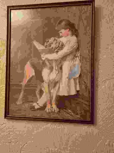 This item is a large-format framed print, likely a late 19th or early 20th-century chromolithograph. The work depicts a well-known Victorian sentimental scene often titled 'Can't You Talk?', originally by George Adolphus Storey and popularized as an advertisement for Pears Soap. It features a young girl in a white dress kneeling on a stone floor, leaning in to look at a large St. Bernard or similar mastiff-type dog face-to-face. The color palette is composed of muted sepia, cream, and earthy brown tones with subtle highlights. The print is housed in a dark wood or wood-veneer frame with a thin gold-toned inner fillet or liner. The construction suggests a commercial reproduction meant for home decor during the late Victorian or Edwardian eras. The overall condition appears fair to good for its age, though there is visible 'foxing' or discoloration consistent with paper oxidation. There are some minor light-damaged spots or surface abrasions, particularly on the dog's legs and the girl's face. The craftsmanship of the print demonstrates the high-quality lithographic techniques of the period, designed to mimic the texture and depth of an oil painting. No specific maker's marks are clearly visible in the image, but the style is quintessential of late 1800s advertising art.
