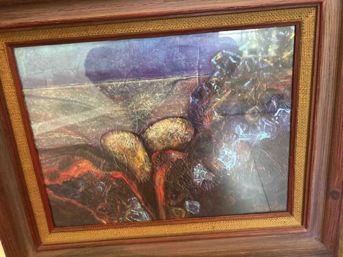 This item is an original abstract piece of art housed in a multi-layered frame. The artwork appears to be a mixed media composition, possibly incorporating paint, collage elements, and textured materials. The color palette is rich and earthy, featuring deep purples, ochres, fiery oranges, and dark browns, with crystalline or fractured patterns on the right side that suggest mineral or geological forms. The surface has a significant impasto or tactile quality, with visible raised segments and crinkled textures. The framing consists of a three-tier design: a wide outer wooden frame with a visible grain, followed by a textured linen or burlap fabric liner in a golden-tan hue, and a final inner wooden fillet. The glass over the artwork shows some glare and reflections, making fine detail assessment difficult but highlighting the dimensional nature of the surface beneath. The frame shows some light scuffing and age-appropriate wear to the wood finish. Based on the framing style and the abstract expressionist influence, the piece likely dates from the late 20th century, approximately 1970-1990. No signature or maker's mark is visible in the provided image, but the craftsmanship of the frame and the complexity of the media suggest a professional artist's work.
