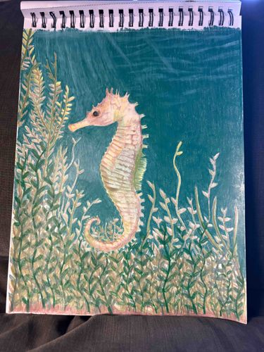 This original hand-drawn artwork features a detailed seahorse as the central subject, rendered on a spiral-bound sketchpad page. The medium appears to be colored pencil, utilizing a layering technique to create depth and texture. The seahorse is depicted in shades of pale yellow, cream, and peach with hints of green along its dorsal fin, showing rhythmic anatomical segments and a curled tail. It is surrounded by lush green and pale yellow aquatic foliage that fills the lower half and left side of the composition. The background is a solid, deep teal or turquoise hue, textured with vertical strokes to suggest light filtering through water. The artwork is contained within a top-spiral sketchbook with a black plastic or metal coil. The paper shows slight curling at the bottom edge, characteristic of medium-weight sketchbook paper reacting to heavy wax or pigment application. There are no visible signatures or dates on the front of the piece. The style is representational with an emphasis on texture and color blending, indicative of a contemporary hobbyist or student work. The overall condition is good, showing bright pigment retention and no significant smudging or tearing across the illustrative surface.