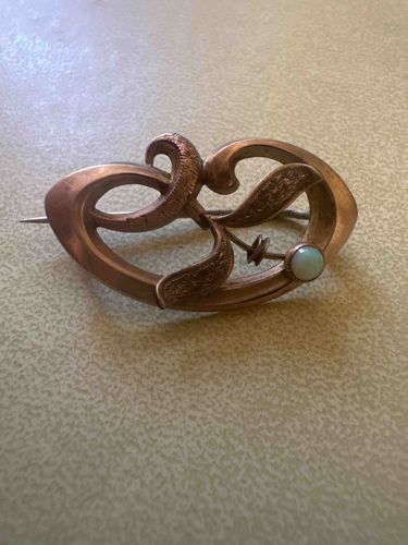 Vintage Art Nouveau Style Rose Gold-Tone Scroll Brooch with Faux Opal
