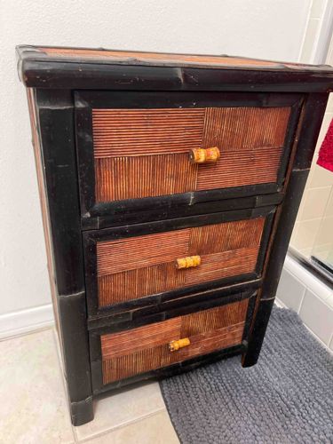 This is a small, three-drawer storage chest or nightstand crafted in the Victorian Aesthetic Movement style, likely dating from the late 19th to early 20th century. The piece features a distinct faux bamboo frame constructed from solid wood turned and carved to resemble bamboo stalks, finished in a dark ebony or deep chocolate stain. The drawer fronts and top surface are inset with panels of split rattan or reed, arranged in a contrasting woven pattern that alternates between horizontal and vertical orientations to create a parquetry effect. The color of the reed work shows a warm, reddish-brown 'burnt' tortoiseshell patina, which was a highly popular exotic finish during the era. The drawers are equipped with small bamboo-style wooden knobs. In terms of condition, there is significant age-related wear including surface abrasions, scuffing on the dark-stained frame, and color fading on the reed panels. The construction shows typical joinery for the period, utilizing mortise and tenon joints common in 'bamboo craze' furniture. While no maker's mark is visible in the photograph, the craftsmanship and design are characteristic of European (often British or French) imports of the Aesthetic period.