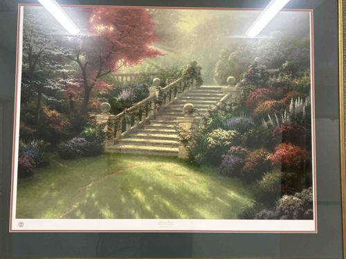A framed, limited edition lithograph print by the renowned artist Thomas Kinkade, titled 'Gardens Beyond Spring Gate'. This work is part of Kinkade's signature romantic-realism style, featuring a lush, ethereal garden scene with a central stone staircase leading toward a soft, glowing light source. The composition is vibrant with floral colors including reds, purples, and whites, contrasted against deep greens and a sun-dappled lawn. The print features a white border containing a small circular seal on the lower left and a printed title centered at the bottom. The piece is professionally matted with a dark green outer mat and a thin reddish-orange inner accent mat, all housed within a gold-toned frame protected by glass. Notably, the user-supplied context states this is numbered 670/770, indicating its status as a highly limited edition. The physical condition appears excellent with no visible signs of foxing, fading, or moisture damage to the print itself, though there are bright studio light reflections on the glass surface. The craftsmanship is typical of the Thomas Kinkade Company's high-standard reproductions from the late 20th to early 21st century, designed to capture the luminous 'Painter of Light' aesthetic through quality offset lithography.