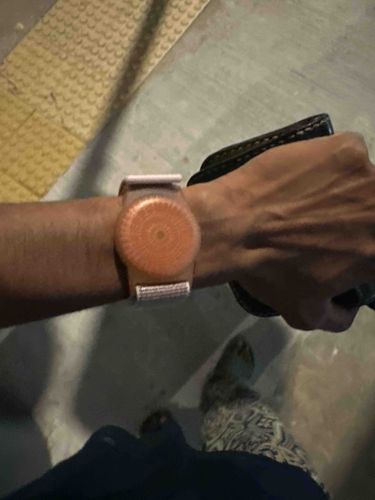 This item is a contemporary wristwatch featuring a distinct circular, orange-toned dial or internal module housed within a translucent, integrated semi-clear plastic or resin case. The orange center displays a textured, concentric sunburst pattern that serves as the focal point of the design. Its construction utilizes lightweight, modern materials including a synthetic casing and a white-to-light-grey woven fabric strap (comparable to a nylon sport loop), which is secured via a wrap-around fastening system. The watch has a minimalistic aesthetic, lacking traditional numeral indices or obvious hands, suggesting a digital or conceptual movement. In terms of condition, the item appears in functional, used condition with visible surface dirt or light patina on the fabric strap and minor micro-scratches consistent with daily wear on the plastic housing. The craftsmanship is industrial and streamlined, indicative of late 2010s to early 2020s tech-forward fashion or smart device accessories. No visible maker marks are identifiable from the top-down perspective, but its sleek profile and material choice suggest a mass-produced consumer electronic or fashion accessory origin.