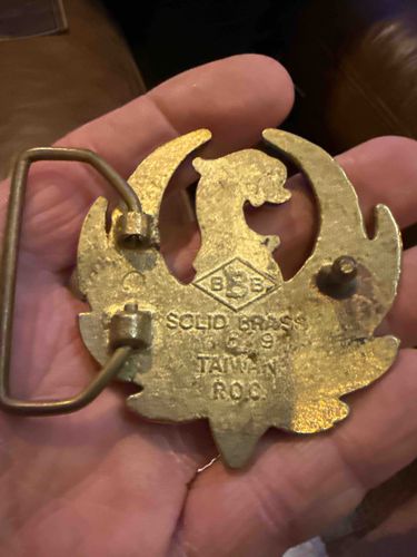 This item is a vintage cast metal belt buckle, identified through its markings as being manufactured in Taiwan (Republic of China). Constructed from solid brass, the piece exhibits a matte gold-colored finish with a visible aged patina, including darkening and oxidation consistent with frequent handling. The reverse side features several stamped identifiers: a 'BBB' logo inside a diamond shape, the text 'SOLID BRASS', a production number '669', and the origin 'TAIWAN R.O.C.' The shape of the buckle is a stylized, open-work mythological motif, likely representing a phoenix or dragon with curved wing-like elements. Mechanically, the buckle retains its original wire frame loop and a stationary post fastener on the opposite side. The surface shows a slightly granular texture characteristic of sand-cast or die-cast brass production, primarily typical of accessory manufacturing from the 1970s or 1980s. Minor surface scratches and dulling of the metal indicate a light to moderate level of usage, but the structural integrity remains sound with no visible breaks in the decorative casting.