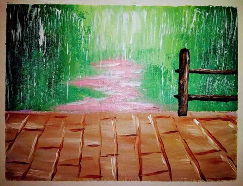 This is an original acrylic painting on a rectangular support, likely paper or canvas board, measuring approximately 12x16 inches based on common hobbyist dimensions. The composition features a foreground of textured wooden floorboards rendered in earthy browns and siennas with dark walnut-colored vertical graining and white highlights. The midground depicts a pinkish-lavender winding path receding into a dense forest. The forest is executed with expressive, vertical impasto strokes of varied greens, ranging from deep forest green to bright lime, accented with white vertical 'rain' or light streaks. A primitive dark brown wooden fence post and two rails sit on the right side of the frame, providing structural contrast to the organic background. The craftsmanship suggests a contemporary or amateur folk-art style, characterized by heavy brushwork and a simplified perspective. No visible signature or date is present in the image. The condition appears fair with no obvious cracking or flaking of the medium, though some slight bowing and irregular edges of the support are visible, suggesting it may be unmounted. The overall aesthetic is evocative of a rainy or misty wooded scene, leaning toward a decorative or student-level artistic output from the late 20th or early 21st century.