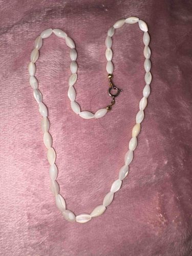 This jewelry piece consists of a single-strand necklace featuring carved mother-of-pearl beads. Each bead is approximately 10-12mm in length, shaped into a stylized marquise or pointed oval form. The beads exhibit the characteristic iridescent, nacreous luster of natural shell, displaying a range of creamy white, soft silver, and subtle pink undertones. The overall aesthetic suggests a mid-20th-century origins, likely between the 1940s and 1970s. The necklace is assembled with a gold-tone spring ring clasp, which shows some minor surface oxidation consistent with age. Notable features include the uniformity of the carving across the strand, though natural variations in shell texture and color can be seen upon close inspection. The condition appears fair to good; there are no immediate signs of bead fragmentation or severe nacre loss, but the stringing material may have slightly stretched over time, creating small gaps between the beads. This style was a popular staple in vintage costume jewelry, often produced in regions like Japan or the Philippines for the Western market. The craftsmanship is evidenced by the smooth polishing of the shell material and the consistent orientation of the bead points.