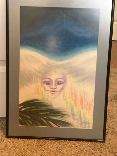 This rectangular vertical artwork features an ethereal, humanoid face emerging from a misty landscape, rendered in what appears to be a mixed media style utilizing pastels, colored pencils, or acrylic washes. The composition is divided into a cosmic upper register dominated by deep blues and a single radiating star, a central bright white nebulous band, and a lower register featuring a row of colorful, flickering flame-like symbols in orange and green. In the bottom left foreground, dark green palm-like fronds provide a sharp contrast in texture. The face itself is centered, with stylized purple-hued eyes and small lips, rendered with soft blending. The piece is professionally housed in a light blue or gray mat and a thin black contemporary metal or wood frame. Based on the style and presentation, it likely dates from the late 20th century, circa 1970-1990, reflecting New Age or visionary art movements. The craftsmanship shows deliberate use of soft gradients and fine line work in the facial features and palm fronds. Condition appears stable, with the artwork protected by glass, though slight undulation of the paper substrate or matting is visible at the bottom edge, which is typical for framed works on paper.