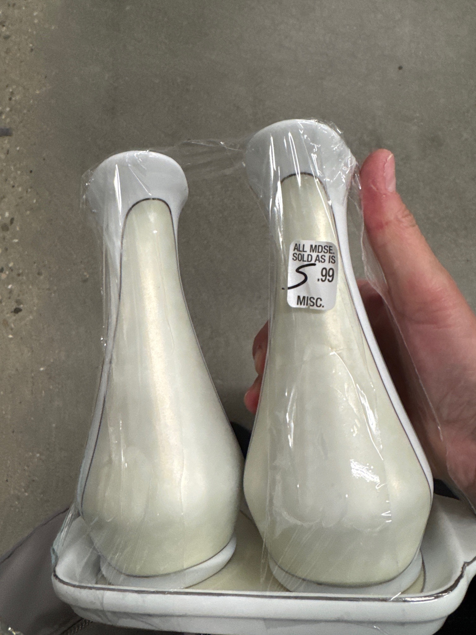 This three-piece set consists of a pair of tall, tapered salt and pepper shakers accompanied by a matching rectangular underplate or tray. The pieces are crafted from ceramic with a distinctive iridescent or 'pearlized' finish, which gives them a soft, lustrous sheen common in mid-century decorative housewares. Each shaker features an ergonomic, elongated bulbous body that narrows significantly at the neck before flaring into a smooth, white rim. A thin gold-toned or metallic pinstripe detail borders the transition between the pearlized body and the white porcelain neck, as well as the rim of the tray, indicating a likely 1950s or 1960s production era. The shakers stand several inches high, suggesting a 'tall boy' style typical of manufacturers like Holt Howard or Ucagco. While currently wrapped in protective plastic, the ceramic appears to be in good vintage condition without visible cracks or large chips. The surface shows minor expected shelf wear and some adhesive residue from a thrift store price tag ($5.99). The craftsmanship reflects mass-produced quality from the post-war era, prioritizing elegant, streamlined silhouettes and decorative glazes suited for formal dining tables.
