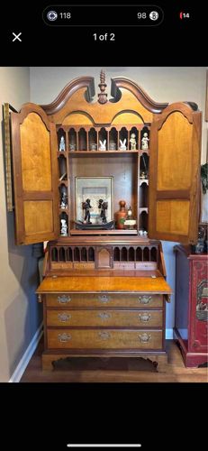 This is a high-quality reproduction of a Colonial-era secretary desk, likely manufactured by Kittinger as part of their Williamsburg Restoration collection during the mid-to-late 20th century. The piece features a two-part construction: a top hutch with a double-broken arch pediment and central flame finial, and a base consisting of a slant-front desk over three graduated drawers. The cabinet doors open to reveal an interior fitted with scalloped pigeonholes and small adjustable shelves, while the desk interior contains a complex arrangement of cubbies and small drawers with a central door. The wood appears to be primary high-grade mahogany or cherry with inset bird's-eye maple or flame birch panels on the doors and drawer fronts, creating a beautiful two-toned aesthetic. The metalwork includes brass batwing-style drawer pulls and escutcheons that mimic 18th-century hardware. The base is supported by bracket feet with a scrolled apron. The condition appears to be excellent with a luminous polished finish; there are no obvious gouges or major sun fading visible, though some minor expected wear at the hinges and corners may be present upon physical inspection. The craftsmanship is indicative of bench-made furniture with deep attention to historical joinery and proportions.