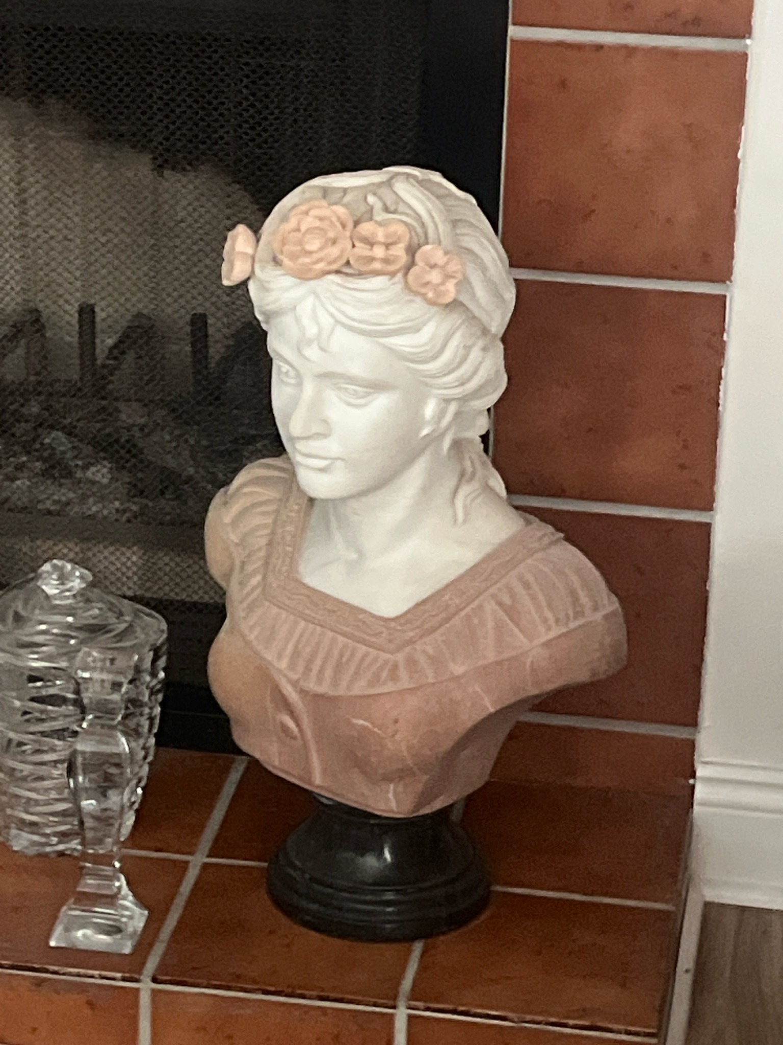 This item is a decorative bust of a young woman, executed in a Neoclassical style. The piece features a striking two-tone composition, with the head and neck rendered in a white finish—suggesting marble or alabaster—while the garment and floral crown are finished in a contrasting terracotta or muted peach tone. The figure is depicted with a serene expression, wavy hair pulled back, and a crown of sculpted roses across the hairline. The base of the bust shows a dress with a pleated or ruffled square-cut neckline and a central button detail. The entire sculpture is mounted on a separate, turned black socle base, likely made of wood or painted resin. Physically, the item appears to be a modern cast made from a composite material like resin or plaster (bonded marble), rather than carved stone, evidenced by the uniform texture and the specific transition of colors. The craftsmanship shows attention to detail in the drapery of the clothing and the individual petals of the floral crown. In terms of condition, there are minor visible surface scuffs and dust accumulation in the crevices of the hair and flowers, consistent with a display piece. No major cracks, chips, or repairs are immediately apparent. The style is reminiscent of late 19th-century European garden statuary, though the material suggests a mid-to-late 20th-century manufacture. No visible maker's marks or signatures are seen in the current view, which is common for mass-produced interior decor pieces of this type.