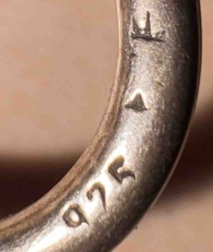 This item is a rounded jewelry component, likely the shank of a ring or a jump ring/bail, constructed from solid sterling silver. The primary physical characteristic is the set of vertical hallmarks stamped into its inward-curving surface. The most prominent stamp is the '925' fineness mark, signifying that the metal is comprised of 92.5% pure silver—the standard for sterling silver. Above the numerical mark is a triangular symbol or delta mark, and further up is an abstracted maker's mark that appears to be a stylized 'FK' or crown-like emblem. The metal exhibits a cool, metallic silver color with a softly polished finish. Regarding condition, the surface shows significant micro-abrasions, tiny nicks, and a developed patina consistent with regular wear and age. There is visible dark oxidation or tarnish deep within the recessed areas of the stamps, which helps highlight the markings but indicates the piece has not been recently professionally cleaned. The rounded construction suggests a high-quality die-struck or cast process followed by machine or hand finishing. While a specific date is difficult to pinpoint from the mark alone, the style of the '925' font is common in post-1970s contemporary jewelry production. The craftsmanship is professional, with stamps that are deep and legible despite the curvature of the metal.