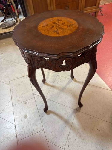 A vintage small-scale occasional or side table typical of mid-20th-century Italian furniture manufacturing. The piece features a scalloped, pie-crust edge top with a prominent central marquetry inlay consisting of lighter wood veneers depicting a floral or foliate motif within a circular medallion. The wood appears to be a stained mahogany or walnut with a dark reddish-brown finish. The apron is heavily decorated with pierced, rococo-style scrolling and acanthus leaf carvings, giving it a highly ornate appearance. It is supported by four slender cabriole legs that exhibit minimal carving at the knees and terminate in small scroll or whorl feet. In terms of condition, there is visible surface wear to the top, including scuffing, loss of luster, and a significant amount of dust or possible finish clouding. The marquetry remains intact but shows signs of age. The craftsmanship suggests a mass-produced piece designed to emulate the 18th-century French Provincial or Rococo Revival style. No maker's marks are immediately visible from the top view, but the construction and styling are highly characteristic of 1950s-1970s Italian exports.