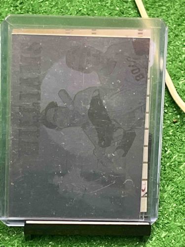 This is a unique 1-of-1 black printing plate used in the manufacturing process of a professional baseball trading card. The plate is constructed from a thin, rectangular sheet of metal, likely aluminum, featuring a monochrome etched image of three baseball players. The top player is visibly wearing a 'BOSTON' jersey. The plate displays the inverted, 'negatived' imagery required for the offset printing process, where this specific plate would have been responsible for transferring black ink. The text 'SILVER' is visibly etched vertically on the left side, indicating the specific card subset or series name. The plate is standard trading card size (approx. 2.5 by 3.5 inches) and is currently enclosed in a protective clear rigid plastic top-loader sleeve. Condition-wise, the plate shows characteristic surface scratches and minor pitting consistent with the industrial printing process. There is visible wear along the edges where the plate was likely clamped into a printing press. Such plates are highly sought-after '1-of-1' collectibles because only one set of plates (Cyan, Magenta, Yellow, Black) is created for each specific card design, ensuring its absolute scarcity. The craftsmanship is industrial, designed for high-volume replication but repurposed here as a unique sports artifact.