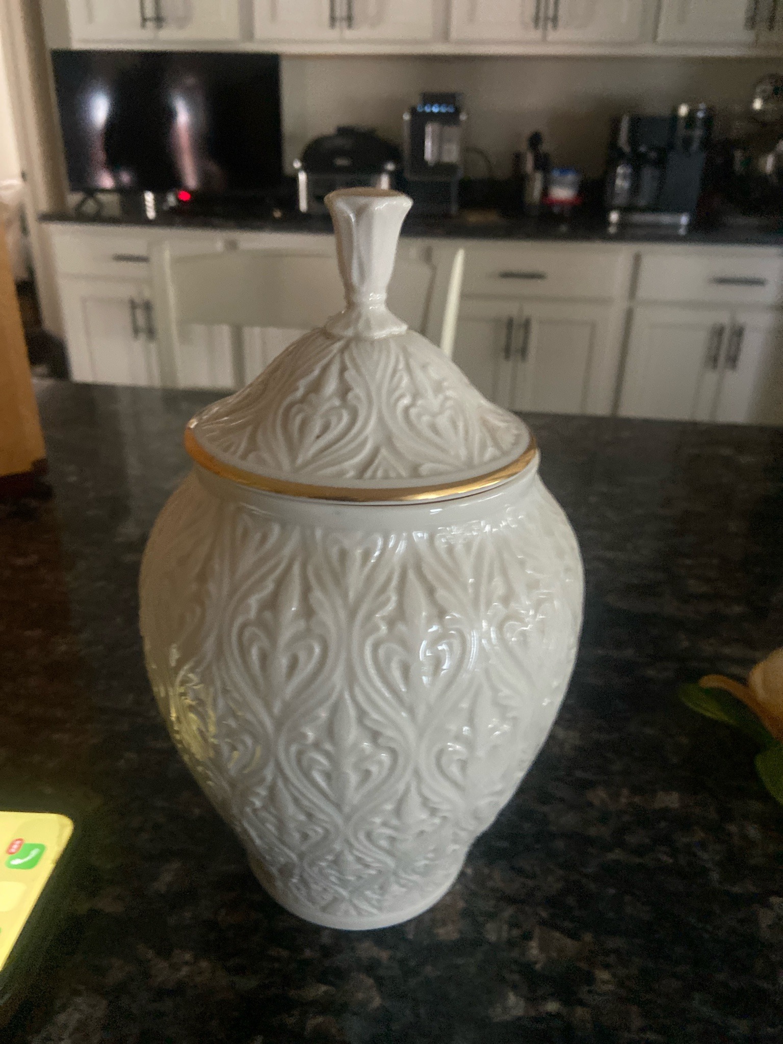 This is a fine ivory-toned porcelain ginger jar with an accompanying domed lid, likely manufactured by Lenox in their signature cream-colored glaze. The vessel features an elegant ovoid body that tapers to a smaller circular base, completely decorated with an intricate, repeating bas-relief pattern of scrolling acanthus leaves and stylized heart motifs. The matching lid is topped with a sophisticated tall pedestal-style finial and is accented with a hand-applied 24-karat gold gilded rim at the lip. The craftsmanship reflects high-quality American porcelain production, popular during the late 20th century (circa 1980s-1990s). The surface possesses a high-gloss vitreous glaze finish that enhances the depth of the embossed scrollwork. Observation shows the piece to be in excellent aesthetic condition with no visible cracks, chips, or crazing. The gold gilding appears intact with minimal signs of friction or wear, suggesting it has been used primarily as a decorative display piece rather than a functional storage container. This specific design is characteristic of the 'Quiescence' or similar decorative giftware lines known for blending Neoclassical textures with a monochromatic palette.