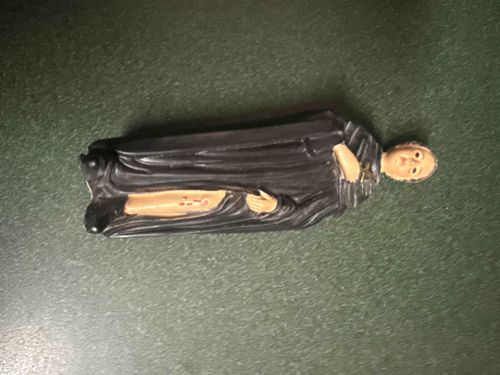 This is a small polychrome devotional figure depicting St. Peregrine Laziosi, the patron saint of cancer patients. The figure is cast, likely from resin or a similar heavy polymer material, and hand-finished with paint. The saint is rendered in his traditional iconographic pose, wearing the black habit of the Servite Order. A crucial distinguishing feature is his exposed right leg, which reveals a visible sore or lesion with red paint highlights, referencing the miraculous healing of his cancerous leg. The figure is shown in a recumbent or standing-upright orientation (as viewed) with a tonsured head and a solemn facial expression. The craftsmanship suggests a mass-produced religious souvenir or liturgical aid, likely dating from the late 20th to early 21st century. The colors include a matte black for the robes and various flesh tones for the skin, with reddish-brown accents for the hair and wound. Condition appears good with minor surface dust, though no significant chips, cracks, or paint loss are visible in the provided image. There are no obvious maker's marks or signatures on the front of the piece, which is typical for small-scale devotional items of this nature.